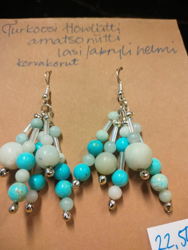 Amatsoniitti, turkoosi howliitti ja lasi-/akryylihelmistä kootut korvakorut