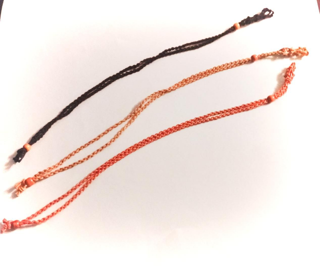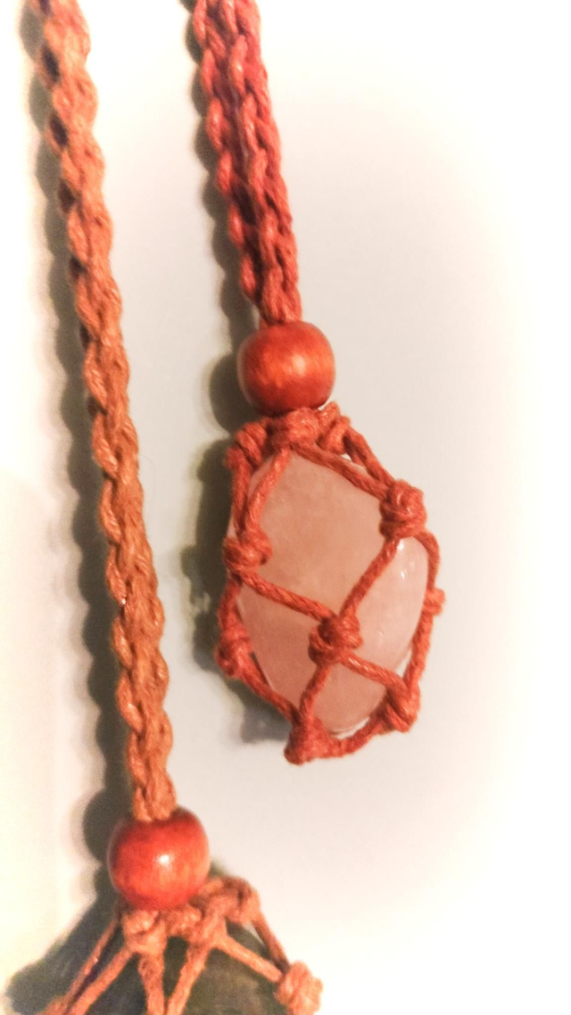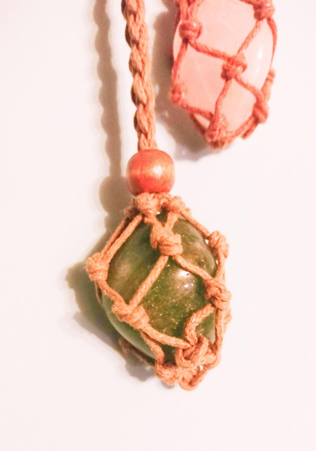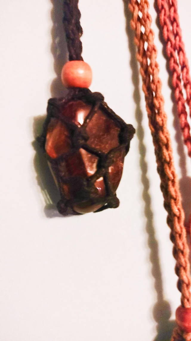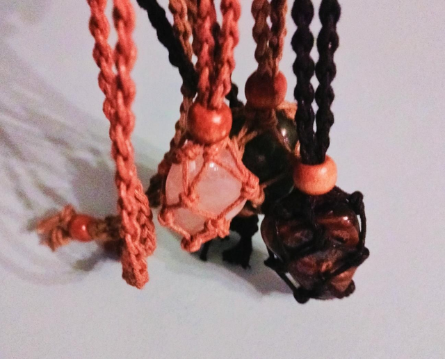 Noin 80 cm ympärysmitalla olevia makramee-kaulanauhoja kolmessa eri värissä. Kaulanauhat on käsintehtyjä ja niihin mahtuu noin 4 cm kivi. Voit käyttää joko raakakiveä tai rumpuhiottua kiveä.